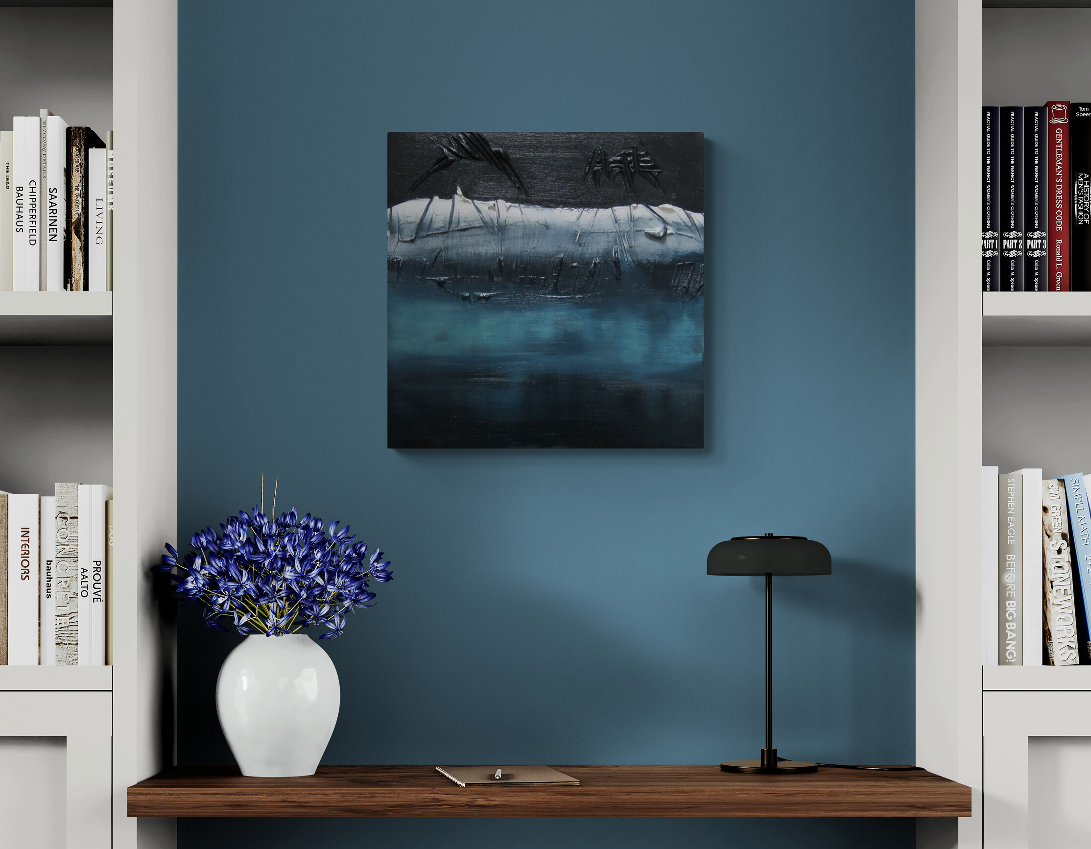 A view from a boat out at sea, at night, and the white cliffs of Dover are fully visible. The chalk lights up the sea in front of the boat. The blue tones in the water are purposefully cold, almost glacial. The water is still.