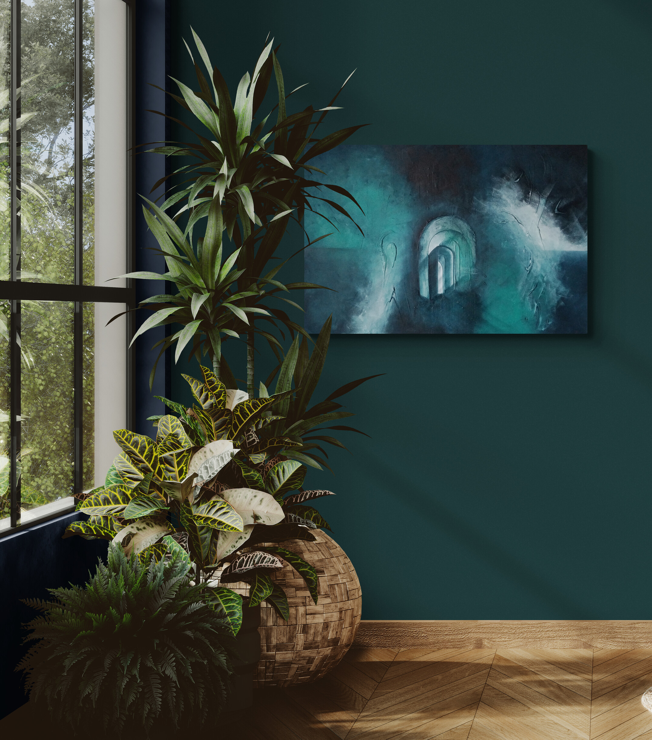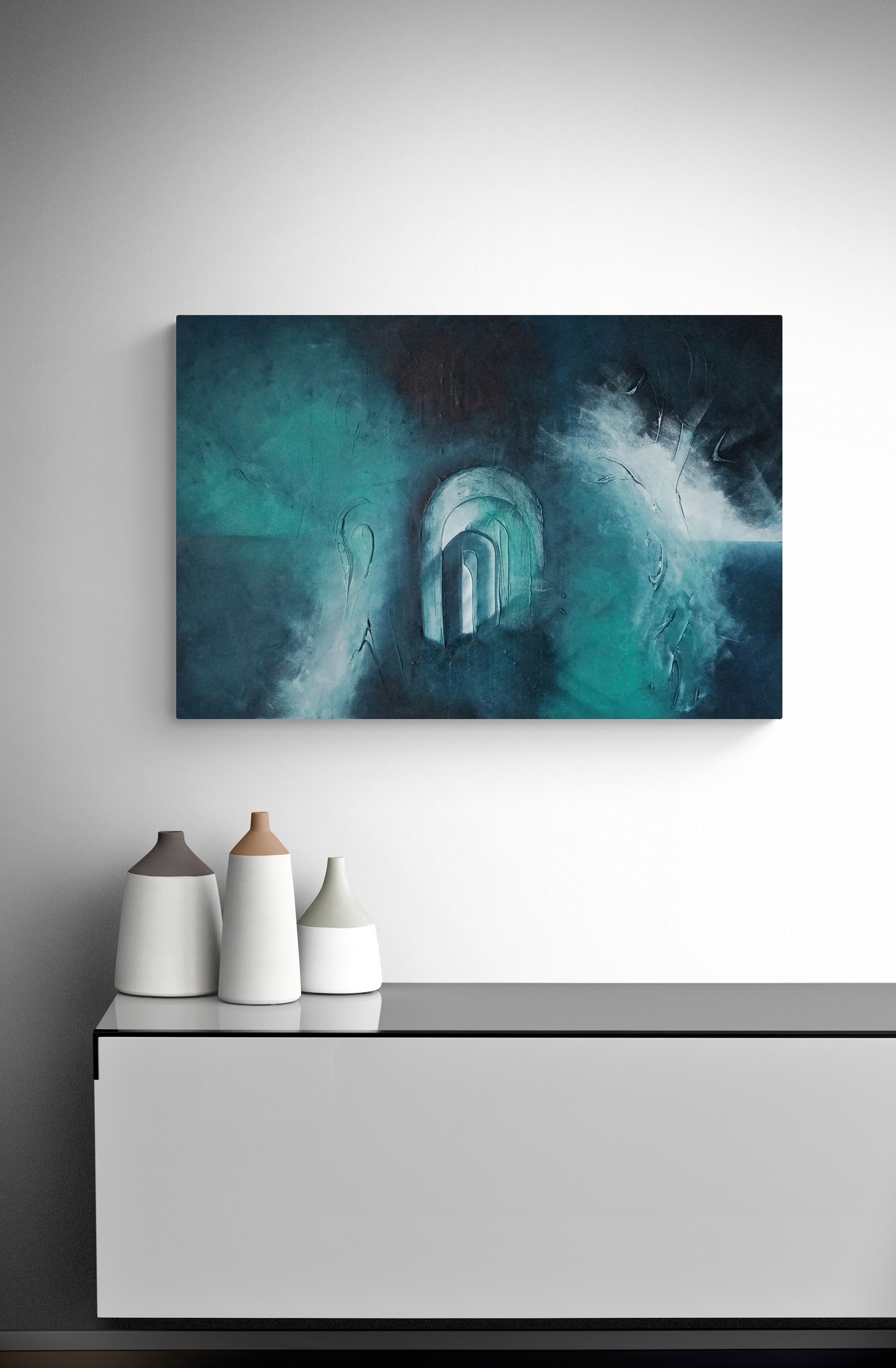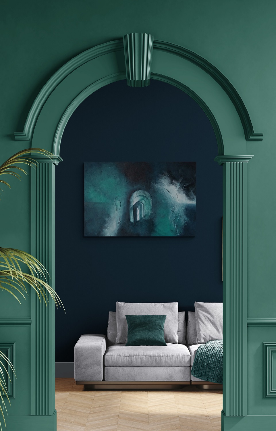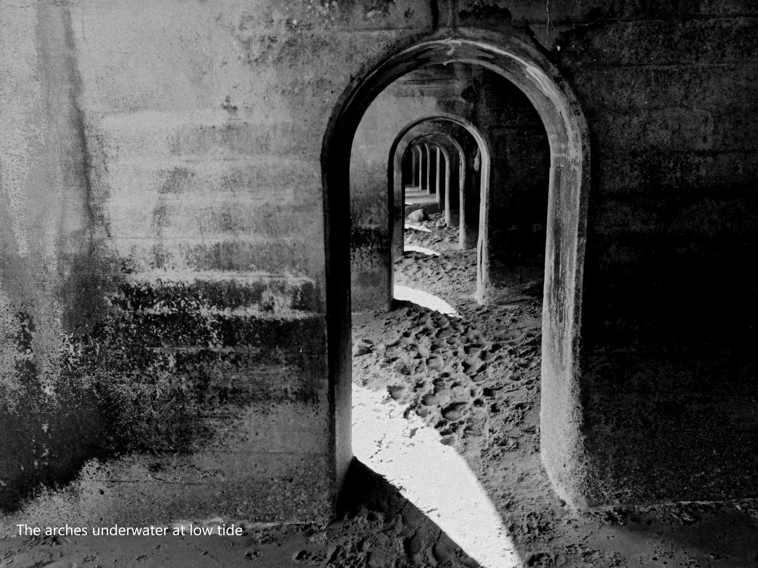 The Arches Underwater is my interpretation of how the arches below the Victorian promenade in Folkestone look during high tide, when they are fully immersed in the cold water. Below the promenade there are a series of arches, only accessible at low tide. When the tide’s out, the old concrete walls reveal themselves with rich, dark green plant life, with imprints of marine life left behind.